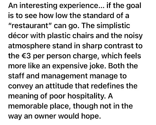 A chiunque stia pensando di mangiare qui: fate attenzione. Se trattano così i clienti paganti che raccontano la loro esperienza, immaginate come siano le cose dietro le quinte.