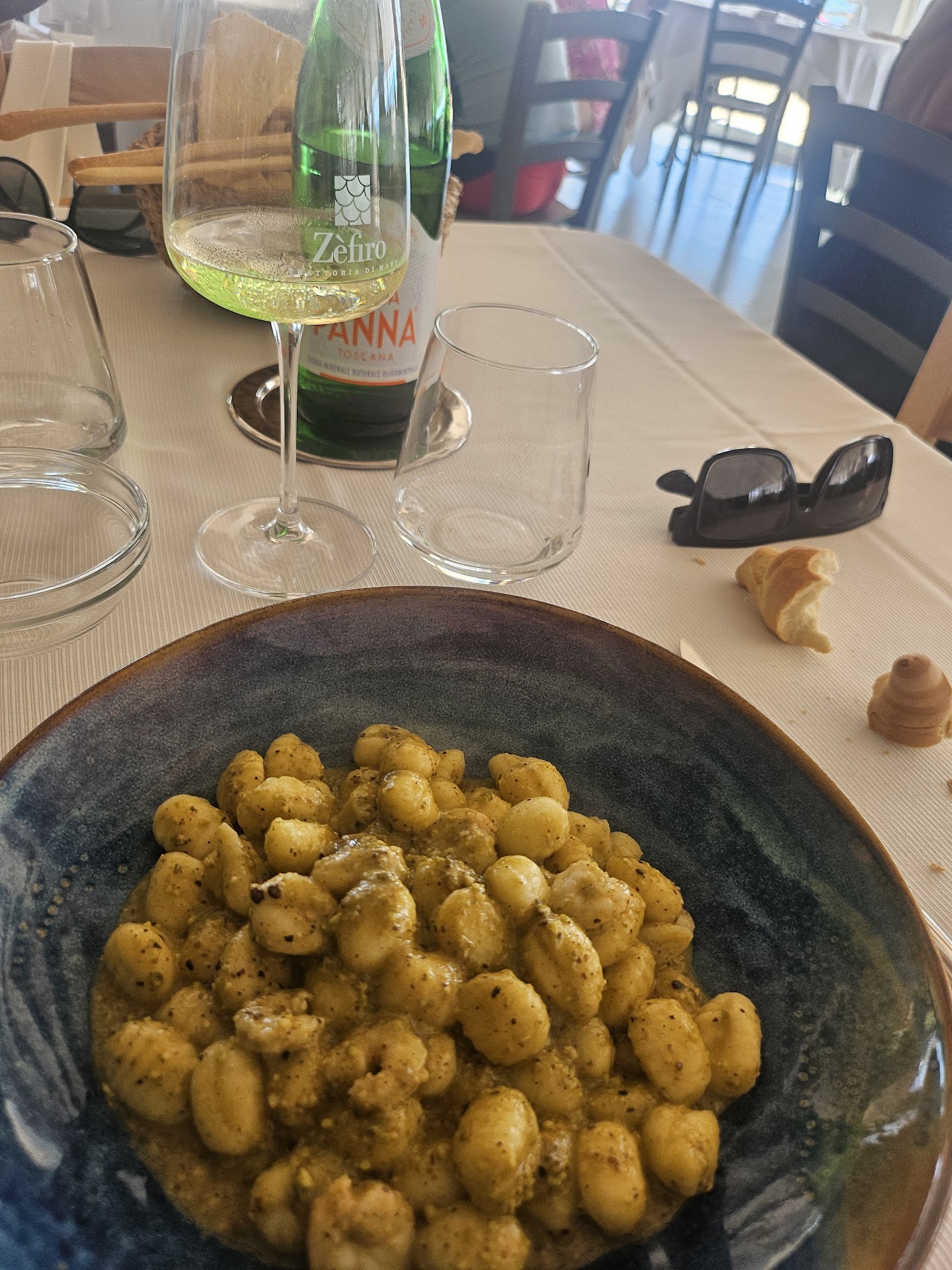Read moreSono appena uscito da questo ristorante fantastico. Giorni a cercare un ristorante di pesce sul mare che fosse proprio cosi: caratteristico, di qualita e non il solito ristorante tipico. Preciso, avendo letto le recensioni: il personale poco cortese MAI VISTO.Qui il personale è cortese, gentile e preparato. Per una foto a mia moglie hanno sollevato le tende apposta, siamo stati fino alle 15.30 senza alcuno che facesse fretta(come spesso accade). Insomma, la scortesia in questo locale NON ESISTE. Ancora: porzioni piccole. Le porzioni qui sono piccole solo se non mangi dal 1930! Non solo sono abbondanti, ma il secondo era cosi abbondante che l'abbiamo potuto dividere in due. Esperienza personale: il crudo di gamberi è fantastico, delicato e completato da una salsa agli agrumi delicatissima. Il cocktail altrettanto. I primi: pasta con le vongole e gnocchi gamberi e pistacchio. Finalmente un piatto con pesto che sia DELICATO! AL 99% sono piatti carichi come fossero da self service. Questo è gustoso ma delicato. La pasta con vongole Finalmente è CON VONGOLE. Di solito è bianca con 3 vongole perse. Il secondo, uno dei piatti migliori: spatola con granella di pistacchio e caciocavallo. Una delizia. Insomma, l'unico dispiacere è avervi scoperto troppo tardi. Ma grazie perché abbiamo mangiato, finalmente, pesce sul mare. E...