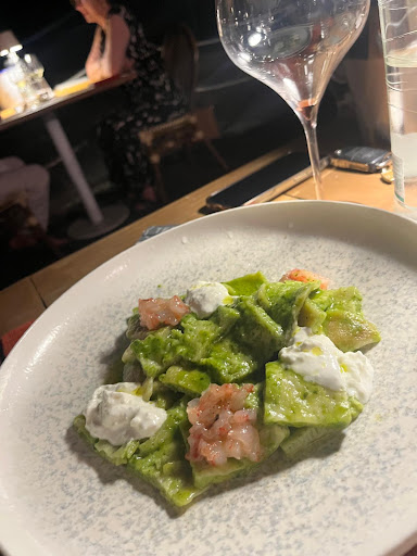 Location perfetta per una cena di coppia: vista mare su un pontile nel centro di San Michele di pagana; ottimo se uno vuole passare una serata in intimità. Il personale è accogliente e molto gentile; soprattutto in alta stagione è consigliabile prenotare perché i tavoli non sono molti e si consiglia di richiedere i tavoli in fondo al pontile. Il locale fa anche aperitivo ma bisogna arrivare prima delle 20 perché poi inizia il servizio. Il menu è vario ma principalmente si basa sul pesce. Il capon magro (antipasto) era molto buono ma non eccezionale, i mandilli al pesto con tartare di gambero rosso e stracciatella, tra i primi, assolutamente degni di nota! I secondi (gallinella con asparago di mare, pomodoro confit e tartare di gallinella; rombo con pere cotte, noci e patate ) ci hanno lasciato un po’ l amaro in bocca perché ci aspettavamo di più ma erano comunque molto buoni. Il tutto accompagnato da un ottimo rosé valdostano consigliato dal gestore che ci ha offerto anche un liquore della casa. I dolci (bavarese al pistacchio con cuore di gianduia) erano molto buoni e particolari. Nel complesso la qualità era alta, la location perfetta e il rapporto con il prezzo assolutamente accettabile per essere in zona Rapallo/Santa Margherita:...