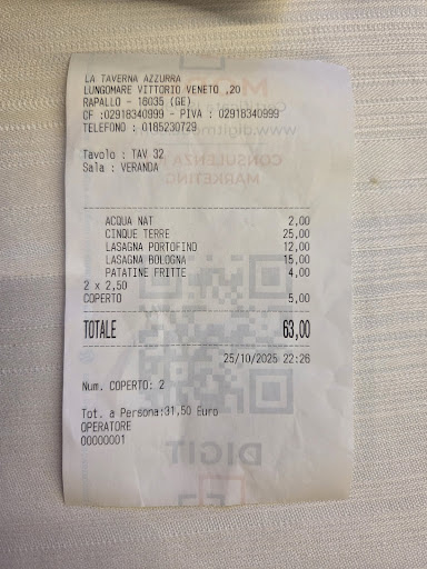 Questo locale davvero merita 5 stelle. Spiego il perché. Abbiamo scelto questo locale dopo aver avuto un spiacevole episodio al l'altro locale qualche metro distante da questo. Taverna Azzurra Rapallo ha scelto di avere il menu con svariate proposte. Sono sicuro che ognuno dei commensali troverà qualcosa per il suo palato. Nel nostro caso abbiamo chiesto Prosciutto Crudo e Mozzarella, Penne con Gamberi e Zucchine, per finire con un dessert Fragole e Gelato. Camerieri di questo locale sanno il loro mestiere si vedeva una giusta sintonia professionale tra di essi. Con il sorriso e con le maniere molto gentili si pongono verso il cliente. Alle richieste dei clienti vedevo sempre il sorriso. Sono molto attenti al cliente dal punto di vista del servizio. Ora parlo del cibo. Crudo e melone si abbinano molto bene crudo era abbastanza dolciastro e mozzarella non mi ha convinto al 100%. Complessivamente piatto riuscito. Ah per accompagnare questo piatto come antipasto avevano offerto una focaccia fatta in casa molto buona. Penne con gamberi e zucchine ecco cosa mi ha stupito molto positivamente. Non ho mai mangiato pasta con gamberi cosi buona forse la migliore. Mi spiego tutto quel sughetto era una cosa deliziosa sapore, profumo da provare. La porzione era giusta quantitativo dei gamberi era abbastanza e sopratutto erano cucinati davvero bene. L'unica pecca e che zucchine sapevano poco di zucchina. ( consiglio tagliarla a julienne e aggiungere in padella giusto 1 minuto prima di servire sul piatto ) Consiglio a tutti questo posto. Se sei in vacanza e non vuoi rovinarti la vacanza scegli questo posto. 2antipasti 1primo 1secondo 2dolci 1acqua 2coperti 1/2bott.vino 1caffè 64€ Vi assicuro che mangerete bene senza...