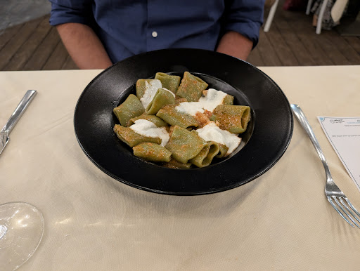 Read moreRistorante con grandi punti di luce tanto quanti punti di ombra (oserei dire buio). Abbiamo prenotato nel pomeriggio del 1 giugno 25 per le 20. Siamo arrivati, ci hanno fatto accomodare e da lì abbiamo aspettato circa 25 minuti per ordinare. Al nostro sollecito, é arrivata una ragazza in palese difficoltà per la gestione della mole di clientela (sottolineo che il ristorante non era al massimo della sua capienza, l’interno era quasi totalmente vuoto) la quale ci ha preso l’ordinazione per 2 volte perché non era riuscita ad inserire l’ordine. A livello di tempistiche ci abbiamo messo circa 10 minuti per ordinare. Abbiamo ordinato, in 3: bottiglia di vino acqua frizzante 2 antipasti di cozze e vongole strozzapreti ai frutti di mare spaghettoni alle vongole paccheri con burrata e gamberi 2 polpi scottati con hummus fritto misto Ci é stato portato subito il vino dalla ragazza che si é occupata dell’ordine e da lì, sono passati altri 30 minuti buoni per avere la bottiglia di acqua ed il primo dei due antipasti. Dopo altri 15 minuti é arrivato il secondo antipasto. Una volta finito, il tavolo é stato sparecchiato alla bene e meglio, lasciandoci con i piatti pieni di gusci di cozze e vongole e il tavolo pieno di scartocci del pane. In attesa dei primi ci siamo guardati intorno, abbiamo capito l’enorme difficoltà nella quale era il personale di sala e ci siamo accorti della presenza di un ragazzo molto molto giovane (a mio avviso definibile bambino ma non avendo la sicurezza dell’età, mi limito al definirlo come molto giovane) che serviva ai tavoli in modo molto impacciato. Dopo circa un’altra mezz’ora di attesa, il ragazzino ci ha portato il primo di uno solo di noi, dopo altri 10 minuti il primo del secondo di noi e per il mio ci sono voluti altri 20 minuti circa (sottolineo che il mio primo é arrivato quando ci stavamo per alzare poiché stanchi dell’attesa infinita). L’ultimo piatto di pasta é stato portato da un ragazzo giovane di nome Giovanni, se non erro, che abbiamo visto lavorare come un mulo durante tutta la serata, sopperendo alle evidenti mancanze del restante personale. A quel punto, abbastanza stanchi e innervositi, abbiamo chiesto di fermare i secondi e ci siamo recati verso la cassa. Li abbiamo trovato una ragazza gentile ma anche qui, molto lenta… quando ci ha chiesto come fosse andata la serata, le abbiamo spiegato il tutto e ci ha proposto uno sconto che ammontava a 5€ a testa. Abbiamo diviso il conto per tre, io ho pagato il mio conto ed il mio compagno ha chiesto di pagare per due. Finita la seconda transazione, ci accorgiamo che la ragazza aveva fatto pagare un solo conto e non due… dunque altro tempo, interminabile tempo, anche per riuscire a pagare una cena buona ma esosa e snervante a livello di tempistiche. Siamo usciti stanchi e per niente soddisfatti. In sunto, cibo buono ma attesa interminabile, con personale di sala assolutamente non capace di gestire la situazione (commento fatto da persone vicine alla ristorazione). Allego al commento le foto di ciò che abbiamo mangiato, ricordandovi che siamo entrati alle 20, non abbiamo mangiato tutto ciò che avevamo ordinato e siamo riusciti a...