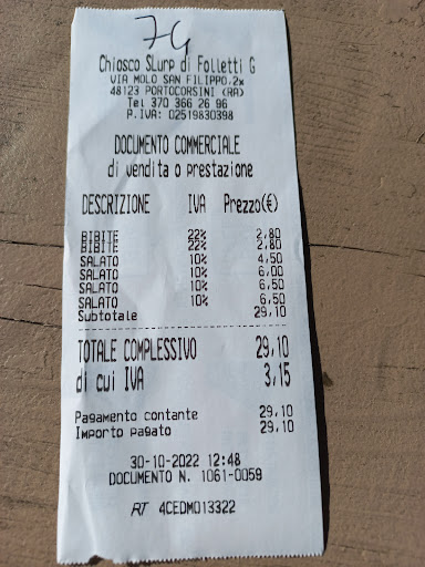 It sits on the corner at the end of the main road in Porto Corsini and is popular with the locals. Its like eating a flat version of a gyro (taco style).