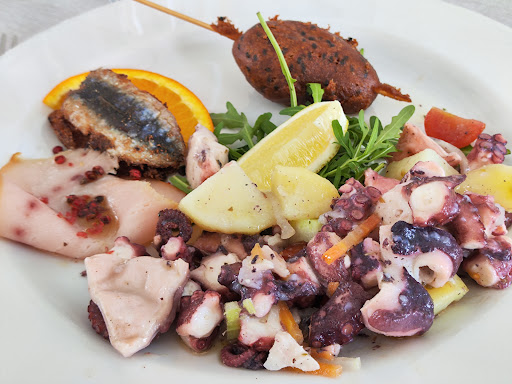 die Lage ist fantastisch..... dafür den Stern Gastro ist schon unterirdisch; die Speisenkarte liest sich recht ambitioniert , scheinbar recht experimentelle Mittelmeerküche der Service ist unter aller Sau - kommt tatsächlich vor das bei fünf am Tisch sitzenden Personen nur zwei bedient werden.... warum auch immer... der bestellte Aperol kam in einem kleinen Wasserglas; nach der Farbe zu urteilen war die Zusammensetzung des Getränkes weit von dem eigentlich georderten entfernt.... ganz anders an den Nachbartischen wo man die typischen großen Ballongläser wohl gefüllt und gerührt mit adäquatem Farbbild sehen konnte. Die Speisen, größtenteils typischer Touristen-Frittösenramsch..... das gebratene Gemüse mit frittiertem Tintenfisch und Gambas war eher als homöopathische Menge zu identifizieren.... insgesamt waren die Portionen sehr klein - ganz anders an den anderen Tischen wo Gäste das Gleiche bestellt hatten und die angereichten Teller nicht mit vermeintlich zusammengefegten Resten der Küche, sondern mit wohlwollenden preisadäquaten Portionen versehen waren. Hier wird mit zweierlei Maß gemessen...... Fazit : viel viel zu teuer - miserable Qualität - miserabler Service - NIE WIEDER...... und ob es nun romantisch ist wenn sich bei traumhaften Sonnenuntergängen das Abendrot in dem umherliegenden Plastikmüll spiegelt sei nun jedem...