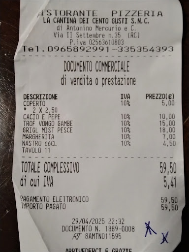 Read more“La cantina dei 100 Gusti”, oppure “La cantina dei 100 cafoni” ? Prenotazione fatta con richiesta di avere un tavolo fuori. Sul loro registro una nota scritta dal ristorante dicendo “dentro”. Siamo con una neonata in passeggino e due persone che soffrono dell’aria condizionata per ragioni di salute. Perciò abbiamo chiesto un tavolo fuori. La nota “dentro” era stata scritta per errore del ristorante (e questo può succedere) oppure per agevolare altre prenotazioni (questo non dovrebbe succedere). Anziché scusarsi dell’errore il gestore (che non sa gestire) si permette di alzare la voce e comportarsi da persona maleducata e poco professionale che è, senza mai ammettere l’errore del ristorante. Ci ha fatto alzare dopo averci dato il tavolo parlando come un bimbo frustrato di nove anni. Tutto questo davanti ad altri clienti, che mi hanno detto, cito, che non avevano “mai visto personale così cafone” nella loro vita. Siamo stati trattati male e questo merita 0 stelle, manco una.