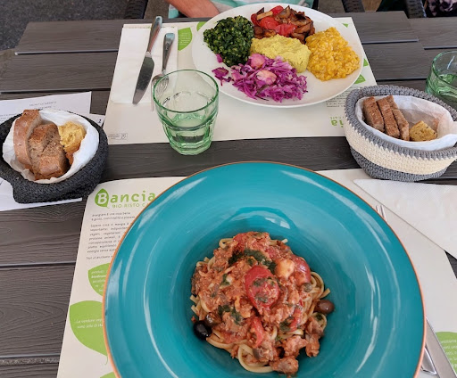 La vita è fatta di incontri, in ogni ambito: personale, professionale, ludico e anche culinario. E' così un giorno approdai al Bancia quasi per caso. Personale gentilissimo, sempre sorridente e disponibile a spiegare ogni singolo piatto. Pranzo ottimo, appetitoso, vario, di qualità (100% bio, frutta e verdura sempre di stagione, sensibilità etiche) e anche bello da vedere nella disposizione cromatica dei colori. Dal primo al secondo, alla scelta fra diverse opzioni per creare il proprio menù di gradimento, fino al dolce: eccellente quella che io ho battezzato come “la divina”, ovvero la torta di ricotta con frutti di bosco. Una chicca che non conoscevo, apprezzatissima, il “Caffè verde”. L'incontro con il Bancia Bio Risto-Caffè -da indisciplinata in ambito culinario quale ero- mi ha aperto un mondo. Feuerbach nel 19esimo secolo sosteneva che “Noi siamo ciò che mangiamo” per evidenziare come le abitudini alimentari di una persona possano dire molto sulle caratteristiche di quella persona. Il cibo influenza non solo la nostra salute, ma anche la nostra personalità e, inevitabilmente, la società. Andare in un ristorante che riesce magistralmente con naturalezza a influenzare la società è... non so come...