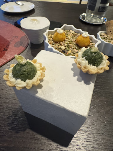 Read moreAssolutamente meritato il posto nella guida. L'ambiente ti proietta immediatamente nei grattacieli dell'America anni 60-70, piacevolmente retrò. La moquette colorata ed il metallo a vista rendono questa location suggestiva e non convenzionale in completo contrasto ad un menù ricercato e contemporaneo. La qualità dei cibi preparati era naturalmente ottima come ci aspetta da un ristorante inserito nella Guida spiccano però alcune portate eccelse che da sole elevano l'esperienza gastronomica. Il mini casatiello in Pan brioches ed i cappelletti rigorosamente fatti a mano ripieni di minestra maritata esaltano in modo pressoché perfetto la fusione di due delle migliori culture gastronomiche d'Italia. Una chicca, chapeaux. Menù di sette portate totali, l'ultima alla quale abbiamo dovuto rinunciare ma solo per insufficienza di spazio. Dalle Amuse bouche al dolce un viaggio nei sapori a volte semplici, come nel caso del salmone e del polpo altre più complesse e rivisitate come lo spaghetto all' assassina e il "cappelletto partenopeo". Riguardo al servizio, nonostante la giovane età del personale, è stato pressoché impeccabile, cordiale ed adeguatamente formale. L'unica nota che avrebbe potuto inficiare tutta la magia è stata non chiedere anticipatamente se fosse di nostro gradimento una nota di piccantezza nelle pietanze. Anche la selezione di vini proposta è stata qualitativamente molto apprezzata, nota estremamente positiva ha seguito a grandi linee la territorialità dei...