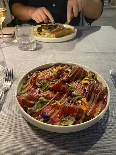 Read moreConosciamo la cucina di questo piacevole e consigliatissimo locale di Reggio Emilia, da tempo ma continuano a stupirci con la loro qualità e ricerca d'innovazione che non abbandona però le radici ben piantate bel territorio. Abbiamo voluto provare l'esperienza in trasferta presso un agriturismo alle porte della città. Serata riuscitissima, con piatti deliziosi. Servizio generoso non invadente, che ti accudisce sapendoti mettere a tuo agio e disponibile per curiosità sul menù. La cena è iniziata con un piatda gustare con il palato e con la vista, servito ad arte come una "tavolozza", gazpacho di curcubitacee...sorprendente. Abbiamo continuato con un assaggio della tradizione servita nel piatto con crudo 24 mesi, erbazzone della casa, preciso perché speciale, e parmigiano Reggiano. Per seguire, assaggio di primi lavagnetta di melanzane e passatelli al limone conditi con crema di parmigiano ed una spolverato a di polvere d'alloro. A questo punto saremmo già stati sazi ma la bontà del della seconda portata consistente in un ganassino brasato e patatine novelle serviti sulla glassa di cottura dello stesso, ci hanno fatto terminare tutto. La cena si è conclusa con zuppa inglese e caffè. Per restare fedeli alla missione di scelta di prodotti a km0 del locale ed alla loro filosofia di rete con produttori locali, abbiamo accompagnato pietanze con un'ottima spergolina fresca della Cantina Bertolani . La temperatura fresca della location, e la buona musica di sottofondo, hanno contribuito a rendere unica la serata. Prezzo della cena 35 euro a testa ben spesi....