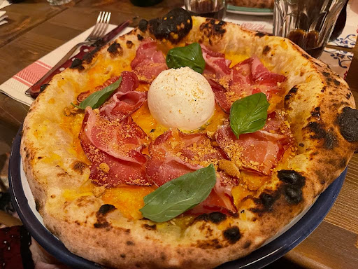 It's definitely a pricier place than a typical pizzeria "da asporto" (which I had been chosing before), but I think it's worth it! The atmosphere and the interior was really pleasant and cosy - loved the red walls, all the neons, jars on the shelves and even the plates (both on the wall and under the pizza). I liked the design of the menu and the fact that you have a QR to the English version of it. (On their website you can also see pictures of all the pizzas, so you can see what you're choosing.) The idea of having one pizza for each region is another thing I liked about this place. I tried the "Puglia" one (just without the olives) and it was definitely something else. My partner had the "Toscana" with the ragù made of the wild boar - and she liked it. I loved the softness of the dough 😍 The staff was really friendly...