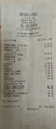 Read moreSiamo stati a pranzo presso l'Osteria Sipario la domenica dopo il concerto degli AC/DC e la nostra esperienza è stata ottima. Il locale è proprio in centro in ztl ma noi abbiamo parcheggiato poco distante dal parcheggio della caserma che è subito dietro. Si tratta di un'osteria un po' vecchio stile e alla buona senza troppi fronzoli sofisticati, cosa che a noi è subito piaciuta perchè ci dava l'idea di posto vissuto e genuino. Eravamo in 5 e abbiamo optato per gnocco fritto e bis di primi (ravioli con funghi, ravioli con patate e tartufo, ravioli verdi col burro e tagliatelle al ragù di prosciutto). Abbiamo preso anche le patate al forno e una giardiniera fatta in casa buonissima. Il tutto accompagnato dal Lambrusco della casa. Il cibo nel complesso è stato ottimo e si sentiva che era fatto in casa rispettando la tipica tradizione emiliana. Il conto è stato onesto sia per la qualità che per la quantità (42 euro a testa). Il personale è stato simpaticissimo, professionale e molto gentile. Davvero consigliato e se potessi darei più...