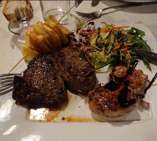 A parte questa disattenzione si mangia benino e i prezzi sono adeguati a locali di questo tipo. Noi eravamo in due quindi abbiamo potuto prendere il menu da 35 euro a persona che include un antipasto per due, un tris di filetti sempre con porzioni proporzionate per due con due spiedi di patate, un calice di vino rosso a testa ed il dolce.