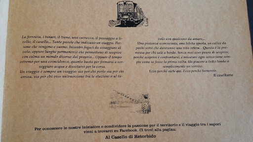 Read moreSorpresa più che piacevole il trovare in aperta campagna, con sullo sfondo la meravigliosa vista delle colline dell'Oltrepò Pavese, una casello restaurato della vecchia ferrovia Voghera-Varzi, dismessa ed il cui sedime è stato trasformato in pista ciclabile. E se il colpo d'occhio vuole e ottiene la sua parte, il corpo non può essere da meno: siamo in presenza di "una enoteca" rappresentante più di 200 tipi di produttori di vino ed un ristorante che, di fatto, è al servizio della degustazione del vino, accoppiando ogni piatto ad un tipo di vino. Il menù non è da meno, molto vario (previsti anche piatti diversi per vegani e bambini) in cui la semplicità degli stessi è regina, ma con la capacità di tenere ben distinti i gusti dei prodotti del territorio e non. Sublime il cioccolato fondente da degustare con un bicchiere di Rhum (notevole) e la simpatia, gentilezza e disponibilità di Patrizia (se sbaglio il nome, non me ne voglia!) che ti invogliano a ritornare ad effettuare un'altra degustazione. Da provare...