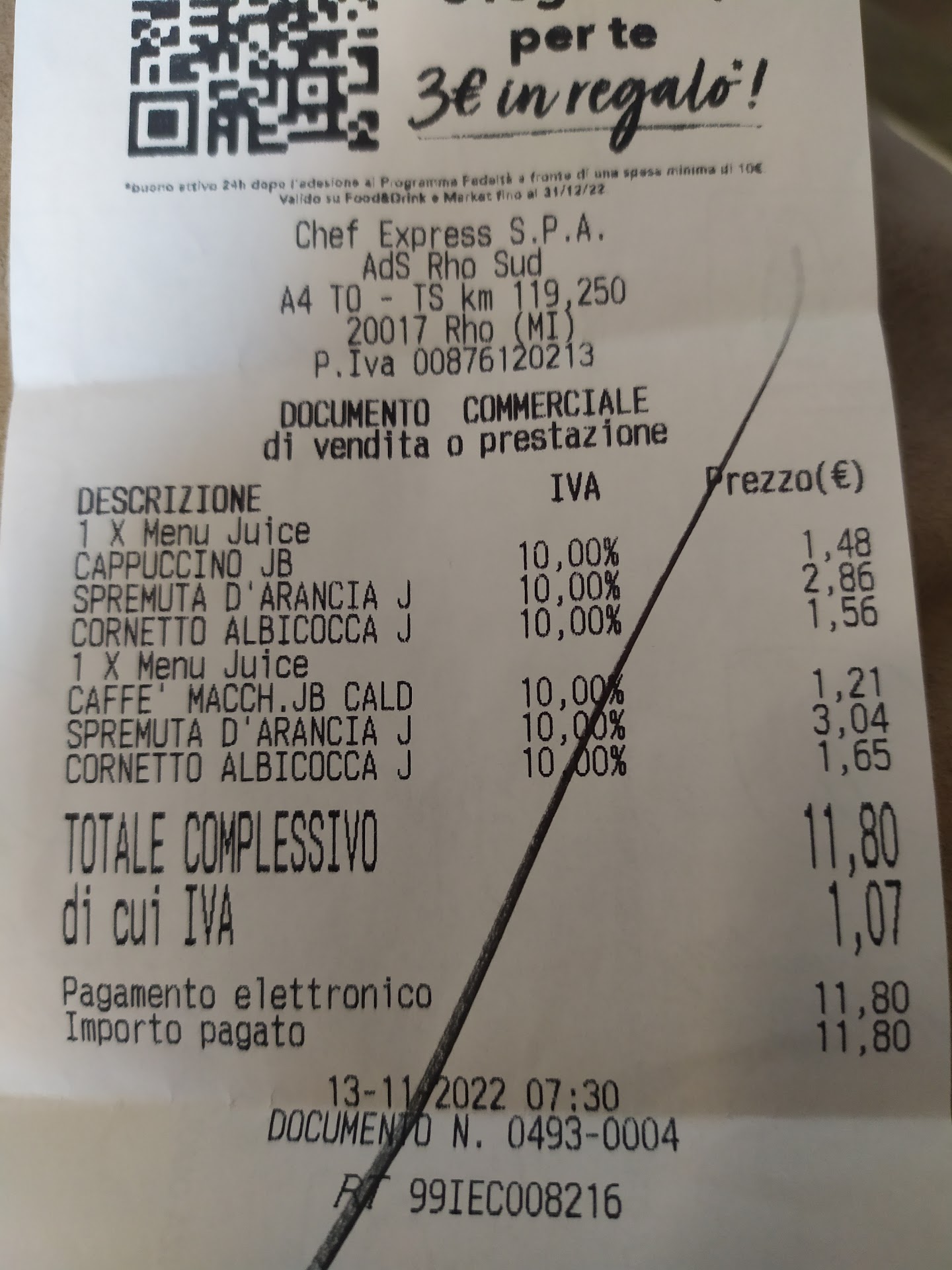 Read moreMi piace essere chiaro quindi dettaglio tutto: 1) I pannelli touch appena entri dicono "Ordina qui per uno sconto del 10%". Nello scontrino non vedo lo sconto. 2) Il servizio è professionale, preciso e cordiale. 3) I prezzi autogrill sono OSCENI. Troppo troppo alti. Un panino a 7,90€ è terrificante. È UN COMPORTAMENTO SCORRETTO verso un utenza obbligata a fermarsi ogni tot km per riposare che viene spolpata nel portafoglio. 4) Caffè buono, spremuta buona ma l'avrei preferita nel bicchiere in vetro. 5) Il croissant è ORRENDO !!! Sembra di plastica, è più buono quello confezionato dei supermercati. Infine sono sempre più convinto che il cibo per i viaggi me lo porto da casa. Dispiace per chi ci lavora ma il trattamento verso gli utenti è pessimo e peggiora...