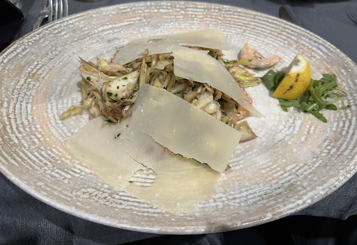 Starters was artichokes with shrimp and topped with slices of parmigiana. Very nice combination of flavors . Next starter was grilled octopus ( perfectly cooked ) accompanied by greens with soft cheese . Amazing plate and great starters .