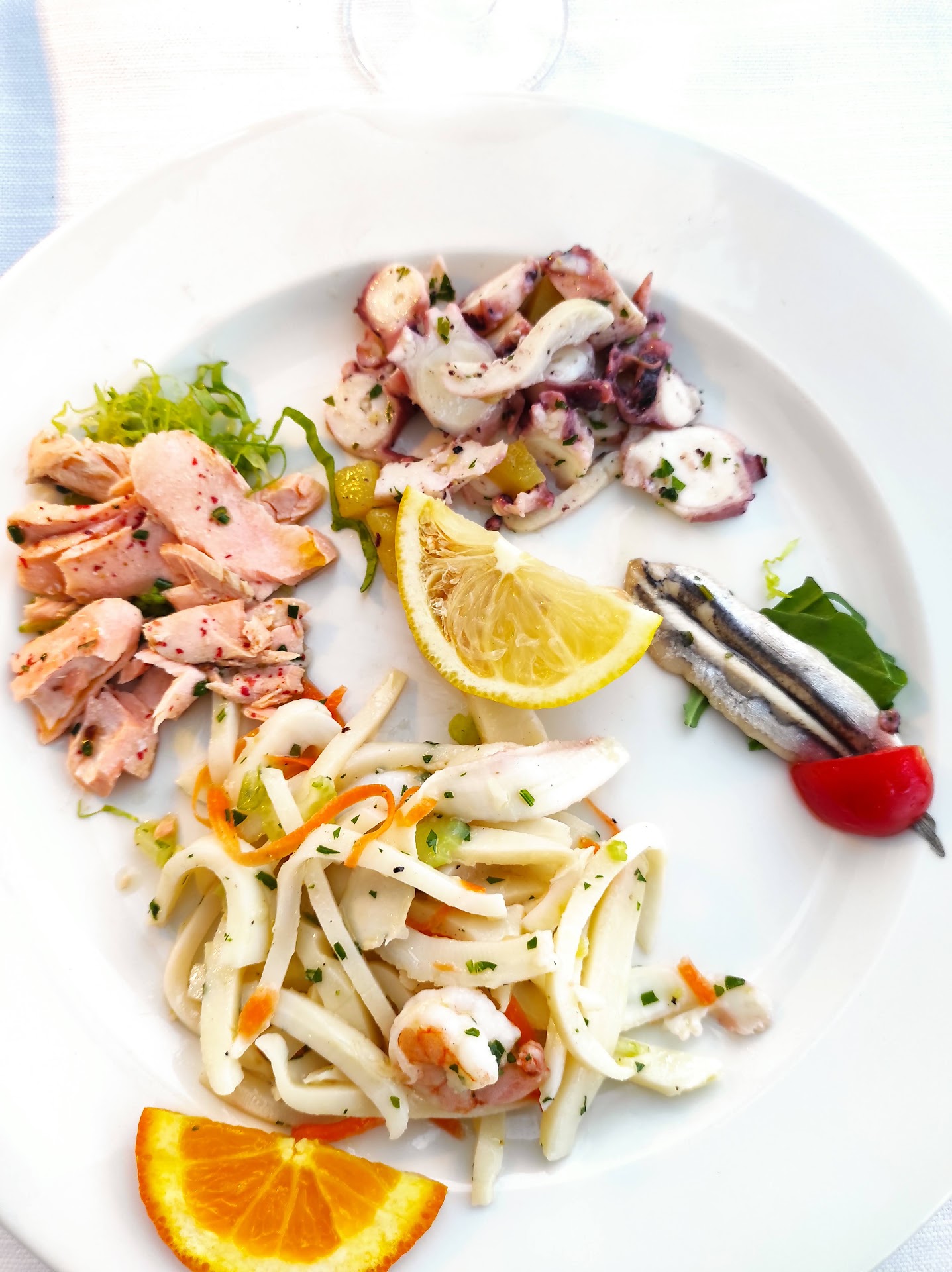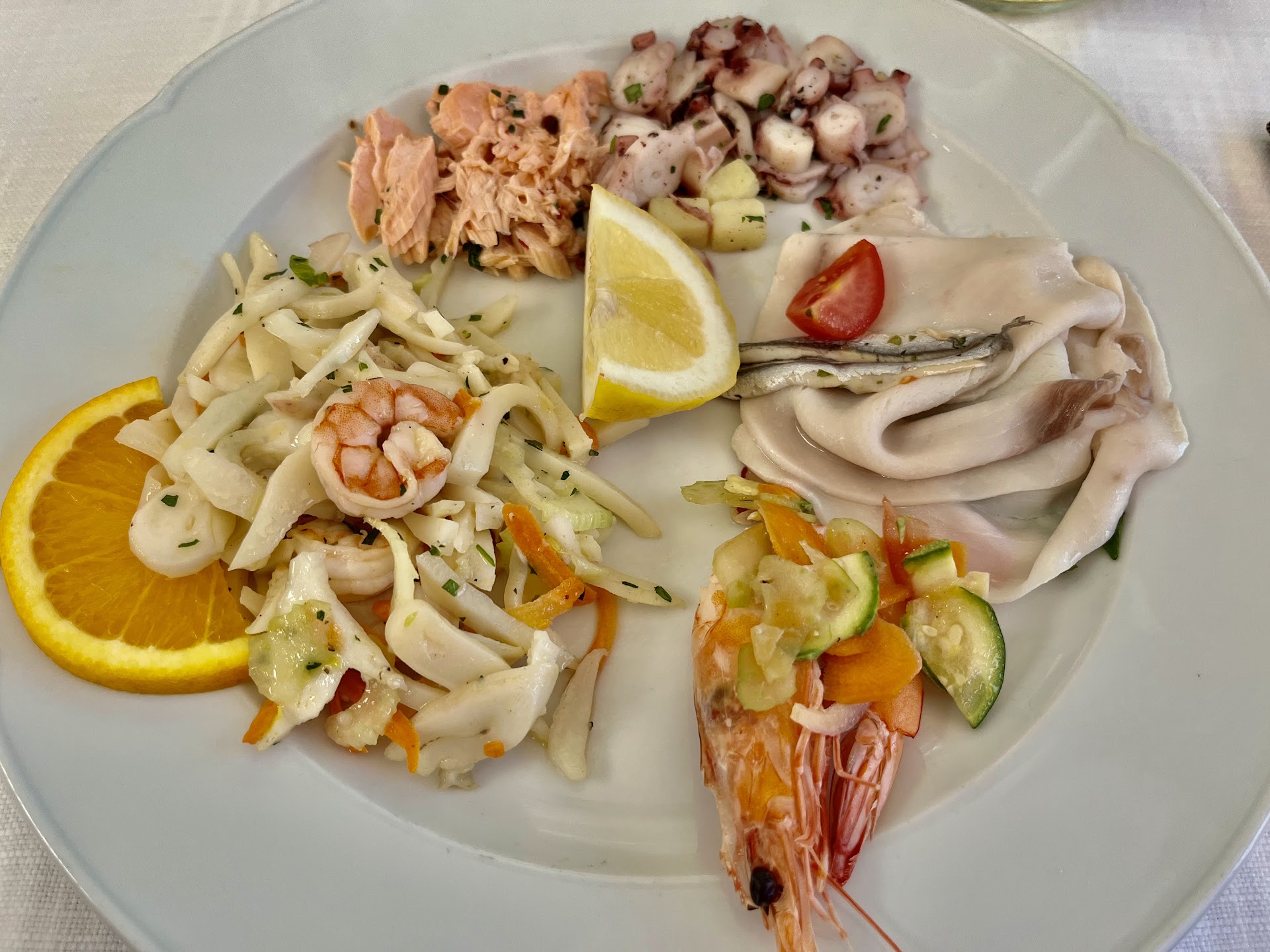Il pranzo è stato organizzato da un’associazione per cui faccio volontariato, quindi il menù era già stato deciso. Abbiamo iniziato con un abbondante e gustoso antipasto misto freddo, che includeva salmone, insalata di mare con sedano e carote, polpo con patate, pesce spada marinato, alici e mazzancolle.