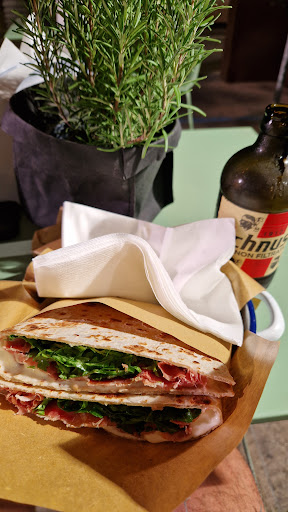 Il menù è vario e ricco di proposte appetitose, con piadine che soddisfano ogni palato. L'attesa per le ordinazioni è stata breve, resa ancora più piacevole dall'offerta di una gustosa piadina con salame come antipasto. Le piadine, grandi e abbondantemente farcite, sono state il vero punto forte del pasto, preparate con ingredienti freschi e di qualità. Per i più piccoli, il ristoro si è concluso in dolcezza con una piadina dolce offerta dalla casa, un gesto che abbiamo apprezzato molto. Il personale è stato sempre gentile e molto attento alle esigenze dei clienti, contribuendo a rendere il pranzo ancora più piacevole.