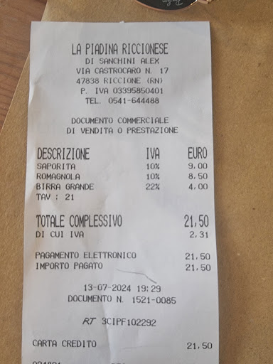 Consigliata da un amico riccionese che come tanti decantano sto locale approfitto per uno spuntino serale presso la piadina riccionese con una mia amica. Nella piadineria c'era solo un tavolo e 2 operatrici alla cottura e il titolare alla cassa per cui confidiamo in un super cassone così come decantatoci. Prendiamo pertanto d’asporto 1 cassone rosso e 1 verde ed il risultato è il seguente: ultimo classificato per essere gentile tra quelli provati tra Ravenna e Cattolica negli ultimi tempi !!! Il cassone era floscio in entrame i casi: le erbe non gustose - difatti erano bietole con un aroma particolare - mentre il ripieno al pomodoro e mozzarella lasciamo stare!!!! Dispiace fare una recensione negativa, ma in Romagna i cassoni devono avere uno standard qualitativo alto e sempre lo stesso, inoltre i cassoni che abbiamo richiesto sono il basico e lo standard del menù di ogni piadineria romagnola dai tempi che furono !!!! Saremo capitate pure nella serata sbagliata ma questa volta è un NO perentorio !!!! Nella speranza che tale recensione sia da sprono per questa piadineria che comunque vanta delle buone recensioni che quanto a noi accaduto non accada a nessun altro !!!! Forza !!!! Siamo in Romagna e la piada e il cassone devono sempre essere eccezionali: ci saranno a Riccione pure tanti turisti non romagnoli ma ci sono pure tanti romagnoli che di fatto vi giudicano sia positivamente che negativamente tutti i santi giorni e non è in questo caso un fattore di mero gusto...