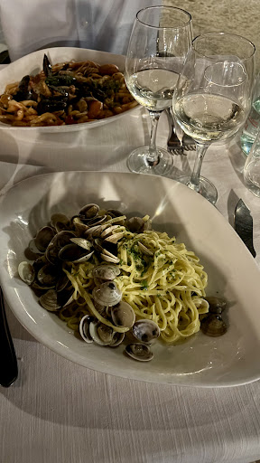 Recensioni lunga, per chi vuole leggere. Prima serata: Posto al tavolo 46, nella terrazza esterna, si vedeva bene il mare. Il cameriere, un signore alto, gentile e simpatico. Abbiamo assaggiato la catalana, la minestra di nonna Caterina e i sardoncini alla griglia. Tutto molto buono. A fine pasto ci hanno portato dei pezzetti di torta alle mele e due digestivi. Il cameriere ci ha consigliato di assaggiare gli spiedini, dicendo che da loro sono un piatto forte e che le persone sono solite prenderli anche fine pasto. Noi, che eravamo già a posto, abbiamo pensato di ritornare il giorno dopo per provarlo.