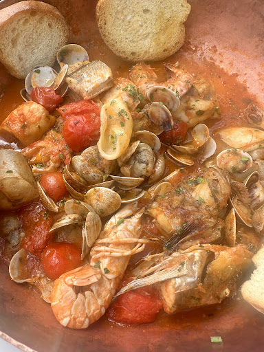 Read moreIniziamo dalla carta dei vini: mediocre e commerciale, ci sarebbe bisogno di una competenza maggiore per una costruzione di bottiglie di cantine di qualità differente. Alla richiesta della zuppetta di pesce con crostoni, il cameriere ci ha tenuto a precisare che nel loro ristorante i piatti non sono precotti e quindi avrei fatto aspettare i 6 commensali per circa 40 minuti se non avessi preso un antipasto(tecnica di vendita di portate). Uno dei 6 non ha ordinato l'antipasto e lo ha fatto pesare augurando solo a lui buon appetito( battuta fuori luogo con faccia seriosa) (non ci stava). Arriva una catalana povera che mi sarei vergognato di servirla. Un trittico di crudo del quale non posso commentare poiché non l'ho assaggiato, ma alla richiesta del commensale al cameriere di poter avere del limone, questa la risposta: "certo signora".. arriva e le dice "prego, eccole il limone per rovinare il pesce il limone va solo sul pesce bollito". No comments. Ad 2 dei 6 arriva la tagliata di tonno, specialità del cuoco...dice.. Servita ben cotta( per me era inguardabile) Arriva la mia zuppetta, e qui l'apoteosi, i 40 minuti sono serviti per fare un bel brasato di pesce attaccato alla padella con la quale viene servita. Non saprei descrivere i sapori di quel piatto, ma solo perché era impossibile sentirli: alcuni pezzettini di pesce avevano un gusto al dir poco non fresco, altri attaccati alla padella, i gamberetti, scotti, plasticosi, inguardabili( più belli quelli in terracotta fatti dagli artigiani di San Gregorio Armeno di Napoli),. Chiaramente impossibile sentirne i gusti perchè la zuppetta era inqualificabile e super cotta, l'unico sapore riconosciuto era il sale(logicamente abbondante) i crostini sapevano di pane della settimana prima.. Uno scempio. Nessuno dei 6 ha ordinato il dolce e questo fa capire che avevamo il terrore della prossima sorpresa ( magari no, avremmo dovuto prendere solo il dolce... Chissà). La location è strategica e chiaramente i clienti arrivano a prescindere, ma vuoi mettere avere una gestione accurata, non dozzinale, moderna, di livello... Anziché un sistema generale mediocre, antico e di qualità non adatta ad un ristoranteddi...