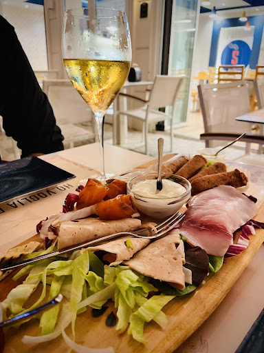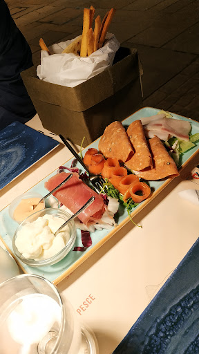 Il piccolo ristorante nel centro di Riccione offre un’esperienza gustativa completamente nuova. La location allestita con semplicità e gusto ti permette di godere del cibo portandoti direttamente sul mare. Dal menu’ abbiamo preso un tagliere di salumi di mare veramente particolare, unico ed originale composti dalla salsiccia di tonno, speck di salmone, cotto di spada, mortadella salmone e spada e porchetta di marlin blu, adagiati su un lettino di insalata mista fresca e il tutto accompagnato da due salse a scelta (noi abbiamo optato per una buona marmellata di cipolle leggera e gustosa ed una maionese speziata) piadine ed ottimi “grissini“. ATTENZIONE: ho apprezzato tantissimo questo dettaglio … i salumi vengono serviti su un tagliere in legno, MA non poggiati direttamente sul tagliere bensì su uno strato di pellicola trasparente, finalmente qualcuno ha pensato all’igiene, bravi i dettagli che fanno la differenza, qualità dei salumi di pesce buonissima e attenzione alla pulizia! Posto da...