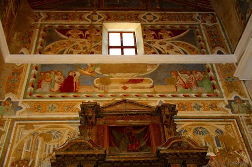 Anche la chiesa ex conventuale di San Francesco, eretta sulla sponda destra del Velino nel popoloso sestiere di Porta Romana de suptus che presto mutò il toponimo assumendo il nome del Santo, conserva memoria della sincera vocazione mariana nutrita dall'Ordine dei Frati Minori, promossa con lo zelo della predicazione e il contrappunto delle immagini. Nei suoi otto secoli di storia, la basilica francescana ha subito mille trasformazioni di volta in volta obbedendo alle esigenze di adeguamento liturgico, intervenendo per bonificare gli ambienti dall'umidità implacabile a così poca distanza dall'argine del fiume o per consolidare l'edificio scosso dai terremoti, così frequenti nel territorio reatino. Ogni generazione volle lasciare traccia saliente della propria fede dotando la chiesa di memorie artistiche ispirate agli stili del tempo. Fu così che le antiche pitture parietali dei primi secoli della seminagione francescana furono scialbate e a volte parzialmente distrutte nel corso di lavori di più radicale impatto. Accadde così per gli affreschi del coro, riscoperti nel 1954 e parzialmente rimossi dopo un primo consolidamento in situ, che raccontano con echi cavalliniani le Storie di San Francesco già narrate ad Assisi dal genio di Giotto. Ma non fu questa l'unica sorpresa riservata dalle antiche pareti della basilica di San Francesco: dopo i terremoti del 1997, quando fu aperto il cantiere per il risarcimento delle lesioni subite dalla chiesa, le pareti del transetto a cornu Evangelii rivelarono quanto rimane di un ciclo di affreschi dai colori brillanti,che narravano attraverso immagini armoniose la scena del Transito della Vergine Maria. L'affresco fu sconciato dall'apertura di un finestrone, decisa ed effettuata intorno al 1635, quando il piano di calpestio della chiesa venne sollevato di qualche metro creando una sorta di camera di sicurezza sfruttata per le sepolture nell'intento di isolare la grande aula basilicale dalle infiltrazioni di umidità aggravate dalle frequenti pianare del Velino. Resta visibile il sepolcro vuoto, l'emozione degli Apostoli che fissano lo sguaardo in cielo dove le schiere degli Angeli fanno da corteggio alla Madonna, la cui immagine resta visibile nella bella tela inclusa nella trabeazione dell'armadio delle reliquie addossato alla parete.
