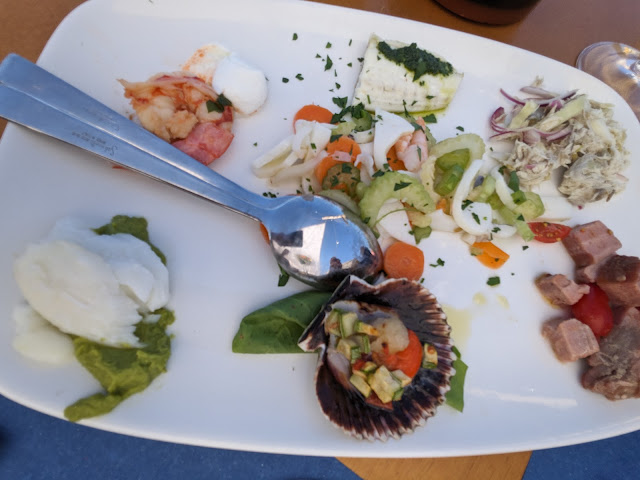 Dopo aver visionato ampiamente il Menù e chiesto ulteriori delucidazioni al cameriere, abbiamo orientato la nostra scelta verso ANTIPASTI FREDDI: con finissima di seppia, mela acerba e finocchi, Filetto di tonno fresco cotto a bassa temperatura con semini di chia e ricotta salata, merluzzo, pomodori disidratati, pesche e quinoa tostata.. PRIMO: strozzaprati allo scoglio SECONDO: arrostita mista di calamari, mazzancolle e sardoncini, fritto misto di paranza, portate con presentazione originale e di ottimo gusto.