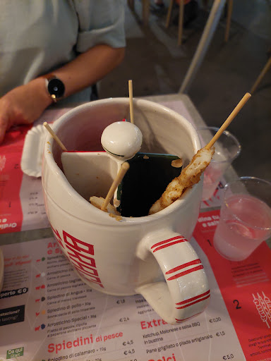 Very interesting way of serving 🙂 Every kind of stick has its color in the menu, we ordered mix of 6 different sticks (10€) and it came in ceramic bucket where each stick had a room with its color so the customer who order the "degustazione menu" can check by the color which stick is with lamb, beef, liver, chicken etc... Then we also ordered 1 stick with shrimps (4€) and 1 stick with calamari (4€) , a grilled bread and piada (1,30 € /each) . Everything was very tasty, fresh, the personal is kind and speaks English very well. It is a self-service, so you have to go inside to order, then you get a device which will be beeping when the food is ready and you can come to take it. There are two sides where you can sit. The left side is with nice lights, music etc, the other is quieter, we sat to the quiet side because the other was a little crowded and loud for us as we wanted to have a chat. It would be nice if both sides had the same atmosphere, just one with louder music and the other quiet. You can also...
