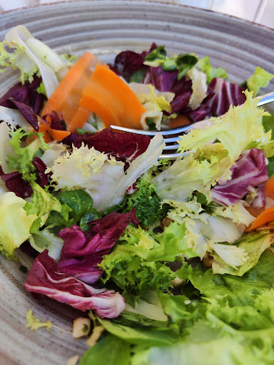 Metti un sabato soleggiato e caldo d'autunno. Trovi una piccola piazzetta davanti al Museo Fellini e pensi beh qui e' perfetto! Temperatura ideale e (finalmente) un po' di relax. Dunque,per la prima volta ho fatto sosta, in questo "bistrot" a Rimini. Nonostante le poche le opzioni, anzi pochissime, a base vegetale pensavo di aver trovato in menù qualcosa di buono ed "interessante". Ho ordinato una insalata VEGA fidandomi della descrizione sulla carta: julienne di carote e finocchi (notoriamente tra gli ortaggi più economici sul mercato) misticanza e frutti secchi. Il piatto servito era composto da 3 fettine di carote, qualcuno di finocchio e tanta tanta tanta insalata. I frutti secchi? In pratica un miraggio... UNA nocciola e noci tritate (forse un paio in tutto, ma non ne sono così sicura sembrava più UNA sola vista la quantità). 3 fettine di pane (apparentemente fatto in casa) come accompagnamento, badate bene incluse! Costo 10 euro un prezzo che sarebbe stato giustificato solo da una abbondanza e varietà di frutti secchi, quella che mi ero immaginata e che avrebbe giustificato il costo. Ci aggiungi un bicchiere di vino (peraltro non bio) e voilà il conto sale in un attimo a 16 €. Lo scontrino non riporta alcuna intestazione fiscale, tuttavia. Mi chiedo: se sull'insegna ci fosse stato scritto "ristorante" quanto sarebbe costata?!?!?? Domanda lecita, mi pare, considerata che il servizio è Easy, da bistrot ( quello si, al contrario del conto, con tovagliette all'americana e tovaglioli in carta come ti aspetti ed è normale che sia).