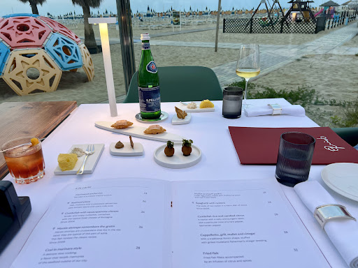 La struttura, situata sul lungomare di Miramare di Rimini, si presenta dall'esterno con discrezione ed eleganza. Il personale di sala e i camerieri mi hanno accolto con gentilezza, conducendomi al mio tavolo. L'arredamento, caratterizzato da eleganza e alcuni elementi distintivi, ha contribuito a creare un'atmosfera accogliente, mentre la vista sul mare è risultata eccezionale.