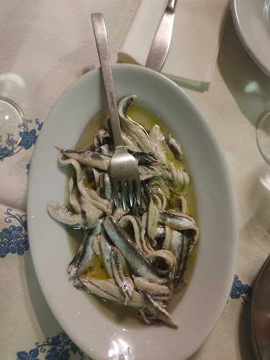 Una bella sorpresa la cena organizzata da amici che ci hanno fatto conoscere questa trattoria di pesce di cui davvero ignoravamo l'esistenza (e pensare che vanta l'iscrizione tra le "botteghe storiche" di Rimini 😅). Il Bar Ristorante L'Ancora Rimini è gestito e portato avanti dalla sola e unica meravigliosa Augusta. Lei è la proprietaria la cameriera, la cuoca e sempre lei riassetta a fine turno. Qui il tempo si è fermato agli anni 70 e il pesce che viene servito è fresco e cucinato come facevano le nostre mamme. Occorre prenotare diversi giorni prima e si mangia quello che Augusta riesce a rimediare il giorno stesso, solo fresco e nella quantità in cui serve, quindi... No menù! Si mangia quello che c'è! Alla cifra di 30 euro ci sono stati serviti due antipasti freddi (insalata di mare e alici marinate), due antipasti caldi (seppia coi piselli e vongole), un bis di primi (risotto e tagliolini allo scoglio), una grigliata mista, un fritto (fatto ancora in padella, come una volta) e sorbetto al limone. Ovviamente abbiamo accompagnato il tutto con del vinello bianco fresco, il Famoso della cantina biodinamica...