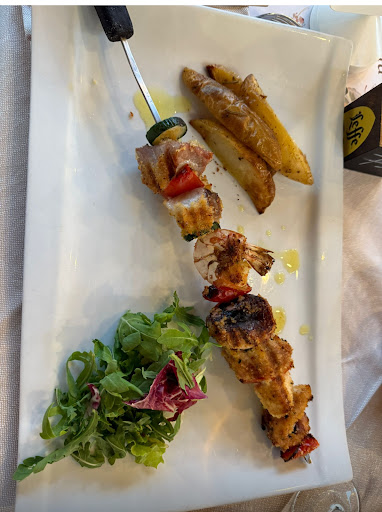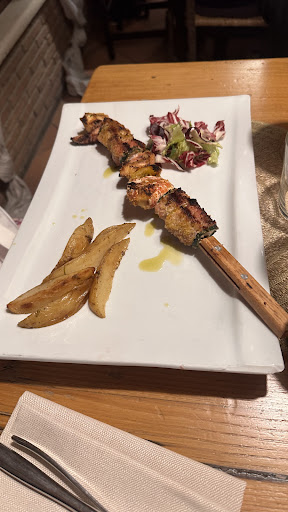 The Spiedone di pesce (€22) was an absolute let-down – the portion was so small you cannot even call it a meal. The potatoes were fried in old rancid oil and tasted awful. We even ordered an extra portion of potatoes, but it was exactly the same, completely inedible. The “seafood skewer” consisted of just a tiny piece of squid (not even a whole one), a small shrimp, and a piece of fish.