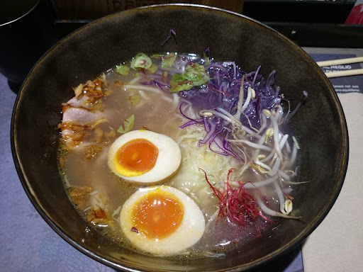 Italian: Abbiamo provato tre piatti al ristorante giapponese di ramen: Onigiri, Gyoza e Ramen. Il ramen non era particolarmente speciale. Il brodo era ok, la carne non era completamente cotta e i noodles avevano più il sapore di pasta italiana che di autentici noodles ramen. Gli Onigiri erano molto buoni, ma i Gyoza erano meno impressionanti. Nel complesso, l’esperienza è stata solo discreta. Non era il miglior ristorante. Quello che ci ha dato più fastidio è stata la mancanza di bevande adeguate; offrivano solo birra giapponese, tè e acqua di sorgente...