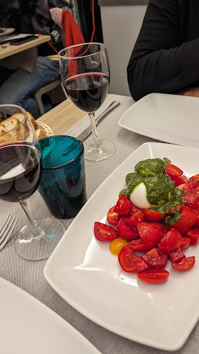 My wife and I split the antipasti, burrata pomodorani e pesto ligure (burrata cheese, tomatoes and pesto), and we also split the primi piatti of taglioni neri tonno (black pasta, burrata cream, and tuna tartare). For secondi, I ordered filetto verdure (sesame coated grilled tuna with caramelized red onion) and she ordered grilled seabream with vegetables and a green pea puree. We couldn't put our forks down! Since the evening was so magical, we decided to get desert as well, and the fig cheese cake was a dream. We finished the meal with some decaf espresso when our server surprised us with a lemoncello with a single cube of ice. All of this for under €100!!!