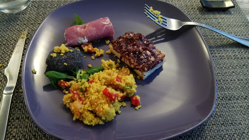 A seguire i 4 antipasti: ottimo ed originale il cous cous al moijto con lime e rum e, fiori di zucca fritti, crostini con cipolla (di Tropea) caramellata e rolata di frittata molto gustosa…. ad accompagnare la portata un buon Dolcetto.