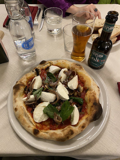 Read moreIl locale propone piatti di cucina spagnola e la pizza. L'offerta è abbastanza ampia e spazia tra antipasti, primi e secondi di carne e pesce. Personalmente ho preso una grigliata di pesce che prevedeva una detta di spada, un filetto di branzino, 2 gamberoni e alcune seppie. Il pesce non era male ma secondo me non freschissimo o comunque non di qualità eccelsa, le verdure grigliate erano ben cotte. Le porzioni sono abbondanti. Le pizze sono secondo me migliori del resto, grandi, con un buon impasto di base, sottili e ben cotte; particolare la pizza con le cozze o con il salmone, ma ce ne sono altre con accostamenti stuzzicanti. Buono lo gnocco fritto con crudo e mozzarella di bufala. Particolare di questo locale è la pasta in crosta, sicuramente scenografico, ma non avendola assaggiata non posso dire se fosse anche buona. I dolci mediocri, niente di eccezionale: tiramisù essenzialmente mascarpone e poco del resto, panna cotta non con un caramello eccelso, abbastanza buona la crema catalana. Forse il più buono è il tortino di cioccolato con cuore caldo e morbido. Prezzi nella media circa 25 euro testa per una grigliata, 3 pizze, 1 gnocco, acqua e 1 birra e 5 dessert. Se posso fare un appunto: le persone al tavolo vanno servite insieme, altrimenti qualcuno mangia e gli altri guardano o il primo servito volendo pii aspettare mangia poi le cose fredde. Se siete di passaggio ci si può fermare, diciamo che personalmente non partirei dall'altra parte della città per...