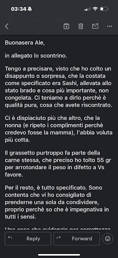 Successivamente mi scrive una mail dicendo che la carne che avevo mangiato era grass feed e non congelata, proveniente dalla Finlandia e nello scontrino mi viene scritto 11,5 euro all’etto. Poi vorrei ben dire, siamo ad asiago, non avete un’azienda che alleva i manzi? Dobbiamo andare per forza a prenderla dalla Finlandia? Non potete mica fare l’opzione per il pappone che decide di regalarvi i soldi per il manzo finlandese? A sto punto vado in una malga e mangio della carne della mia terra congelata o meno che sia…