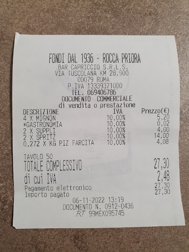 Read moreConosco questo posto da circa un anno e mezzo, in questa occasione ci siamo fermati per uno spritz durante un giro in moto ai Castelli. Che dire, la location, la varietà e qualità di cibi alla tavola calda, la professionalità del personale sono totalmente fuori discussione. Anzi, ci tornerò alla prossima occasione utile. Ciò che stavolta però mi ha lasciato un pò con "l'amaro in bocca", è stato il conto. In particolare non mi aspettavo un prezzo così spinto su due spritz al calice: € 7,00 cadauno. Altra batosta poi per 4 bignè al cioccolato: € 1,30 cad. La qualità, ripeto, è fuori discussione. Qui si tratta solo di una scelta commerciale: sono tante le caffetterie di qualità dove si trovano i mignon a € 0,80. Inoltre, gli spritz oltre i 5 € finora li ho trovati solo in centro a Roma. La cameriera, che ringrazio per la gentilezza, mi ha fatto notare che se avessi scelto di fare l'"Aperitivo" avremmo pagato € 10,00 a testa con incluso cocktail e tagliere molto farcito. Ma a noi oggi bastava solo uno spritz, con un pezzo di focaccia e un buon supplì. Alla...