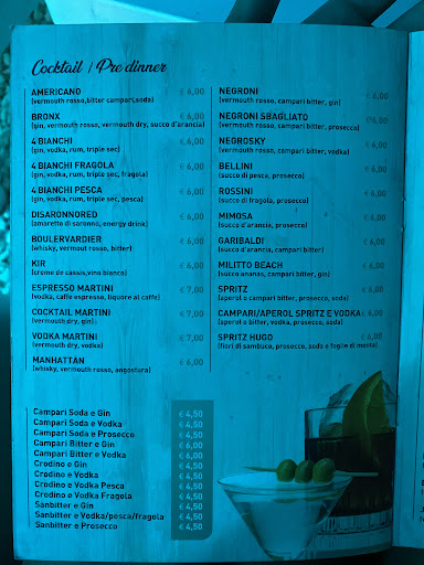 Read moreCute bar by the beach, they offer a huge variety of cocktails for every taste and you can do a little aperitivo as well, with chips and salatini. They do some food as well, but we only went for a drink, the atmosphere is really nice and relaxing, if you book or get there early you can get the comfy chairs on the first row on the beach side. Would definitely recommend the...