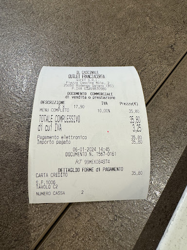 Ogni volta che vado all'outlet Franciacorta ormai è il mio posto per pranzare! Il cascinale offre varie tipologie di menù a prezzo fisso, io prendo sempre il menù completo a 17,90€ circa composto da: un primo e un secondo a scelta, e poi c'è da scegliere tra contorno, frutta o dolce, la bibita è compresa così come il caffè ( almeno per questo tipo di menù). Rapporto qualità-prezzo è buono perché il cibo è quasi sempre gustoso ( poi può capitare che ci sia qualcosa che non piace o che non è al top). Poi c'è sempre come piatto fisso sia i casoncelli che la tagliata, il prezzo però varia perché non rientra nei piatti dei vari menù. Locale pulito e personale gentile sia nel reparto " mensa" che alla cassa. Io lo consiglio a chi cerca l'alternativa alla piadina e al panino che raggiungono la stessa cifra...