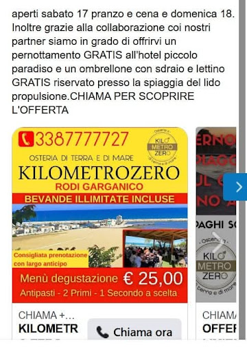 Capitati un po per caso di ritorno dalle tremiti affamati e stanchi ci imbattiamo in questo cartello... Km 0 ristorante a menù fisso 20€. Ok, senza pensarci su due volte e ricordandomi della pubblicità in cui mi ero imbattuto su Facebook nei nostri giorni di permanenza in quel di San. Menaio chiamo e prenoto per 4. Alle 21 puntuali siamo lì. Posto gradevole con terrazzino vista porto. Veniamo subito accolti cordialmente dal titolare, che ci illustra la formula del menù kilometro zero. Si tratta di una formula all you can eat che di base comprende: Antipasti, 2 primi e 1 secondo. Dopo pochi minuti sono arrivati gli antipasti: pepata di cozze(nella norma), insalata di polpo(mischiata letteralmente con il condiriso sottaceto), bruschette, parmigiana di melanzane (buona), cozze ripiene al sugo (buone), zucca fritta (troppa pastella e fredde) melanzane ripiene (nella norma). Dopo poco ecco arrivare i primi: Paccheri allo scoglio e trofie zucchine gamberi 2 belle sperlunghe, classicamente precotti e scaldati ma devo dire graditi. A questo punto la nostra Fame si era sopita finalmente quando ad un tratto eccolo il secondo: La frittura di pesce, (nella fattispecie calamari e gamberi) croccante anche se un po pesantuccia anch'essa gradita. Il tempo di finire la bottiglia di bianco (buono) extra menù e chiediamo il conto che la cameriera ci fa a memoria sommando 4 menù da 20 e una bottiglia da 15 più 3 euro di acqua...totale 98. Che dire, soddisfatti della mangiata e delle quantità che in quella situazione era quello che ci auguravamo per quella giornata. Qualità da Alessandro borghese no ma ce lo aspettavamo, alla fine politically correct se cercate una mangiata senza infamia e senza gloria a prezzi più che popolari. Poteva andare mooolto peggio....