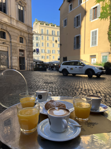 A delightful little cafe!! We met up with our friend at the Campo Di Fiore market just around the corner and we were looking for a coffee to start our day before a long day of walking around Rome. A vendor at the market recommended this spot and we are so glad we found it! Great atmosphere, friendly and attentive service, and delicious pastries and coffees. We ordered the “Italian breakfast combo” which is your choice of coffee, your choice of pastry, and a glass of freshly squeezed orange juice and toast. It was so good we went back again the next day! The first day I got a donut and a double cappuccino, and the second day I got a pain au chocolate and a double cappuccino. So tasty! My sister got the croissant filled with jam and said it was delicious as well. The coffee in the clear glass on the table was a latte and was also good, but I recommend the cappuccino! There is another combo option that doesn’t include the toast that we ended up getting on...