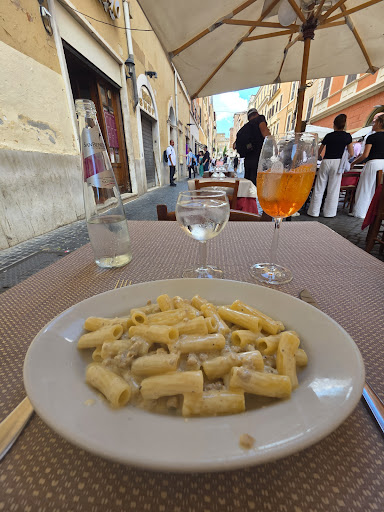 My favorite is the pictured Rigattoni alla norcina, arguably the best norcina in Rome. It pairs beautifully with an Aperol or with the house fizzy white. (When in Italy, do as Italians do: a glass of wine is not only acceptable, but almost mandatory!)