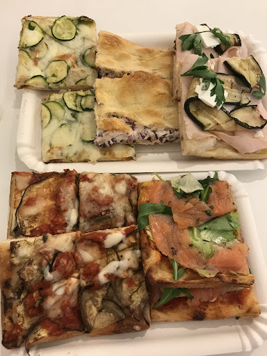 L'eccellenza della pizza, non c'è che dire. Sempre calda e perfettamente cotta, con un assortimento di gusti a dir poco strepitoso, ivi compresi abbinamenti ricercati, raffinati e, in un certo qual modo, introvabili o persino fuori dal comune, quali, a mero titolo di esempio, la pizza alla carbonara, la cacio e pepe, la pizza con gamberetti o, perché no?, la pizza farcita con Nutella!!! Naturalmente non mancano i gusti classici, quali la tradizionale Margherita, la Napoletana o la Marinara. E, per non farsi mancare nulla, non mancano neanche ottimi supplì e arancini serviti sempre caldissimi! E sono altresì disponibili la pizza bianca farcita con tonno e radicchio, con provola e prosciutto cotto o semplicemente con la classica mortadella: accostamenti davvero eccellenti pur nella loro estrema semplicità!! La cartina al tornasole è che, specie durante la pausa pranzo, è presente sempre una sostanziosa fila di acquirenti, per cui bisogna armarsi del numerino "levacode" e... di una buona dose di pazienza, prima di arrivare a gustare cotante prelibatezze. In tale ultimo senso, il rischio di farsi ammaliare da queste ultime ed esagerare con le quantità è tutt'altro che remoto. Ma, occhio, che il conto potrebbe essere di conseguenza parecchio salato!! 🤪🙂 Un piccolo appunto: i tavoli andrebbero occupati solo da chi sta consumando la pizza, mentre spesso e volentieri vengono utilizzati come "parcheggio" da avventori talora neanche in fila! E inoltre, considerato l'avvicendamento continuo di clienti, sarebbe buona norma procedere un po' più spesso alla pulizia dei tavoli che, talora, possono risultare ancora sporchi dei residui di cibo lasciati dagli avventori precedenti. Per il resto... promossi a...