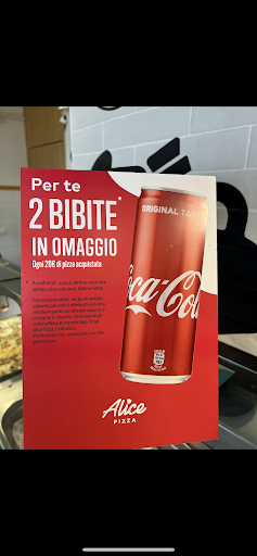 Purtroppo devo segnalare uno spiacevole episodio accaduto presso Alice pizza di Via Tito Labieno. Entrando nella pizzeria e sopra al bancone in vetro, vedo esposto un depliant che riportava la seguente offera, “due bibite in omaggio ogni 20€ di pizza acquistata”. A fronte di una spesa di 22,45€ chiedo gentilmente alla ragazza due lattine di coca-cola come da offerta, la ragazza mi risponde che l’offerta è riservata ai titolari della loro fidelity card, dopo avergli fatto notare che sul depliant non c’è scritto quanto da lei affermato, la stessa risponde che anche se non c’è scritto per lei è così e basta! Gli dico quindi che in questo modo o è stata esposta una pubblicità ingannevole oppure stando nella ragione avrebbe dovuto consegnare le due lattine come da offerta. Nulla da fare, la “simpatica” ragazza dice che è come dice lei e stop! Amareggiato chiedo quindi di poter fare la fidelity card, anche se non necessaria e di poter aderire finalmente all’offerta, purtroppo la scortesia verso il cliente continua dicendo che lei non vede l’ora di andarsene in ferie e chiude il discorso! Conclusione pago quanto richiesto per la pizza e l’acqua e successivamente prendo una lattina di coca-cola sperando in un miracolo, ma nulla, vado dalla ormai “simpaticissima” ragazza e ironicamente chiedo se fosse offerta o se andava pagata…la risposta è scontata e a testimonianza allego foto dell’offerta pubblicizzata e...