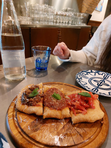 I split a Reginella and a Tonino with a friend, and we were super full by the end of the meal. The Reginella was not super heavy for a fried pizza. The cicoli paired well with the buffalo cheese and ricotta and balanced salty, savory flavors. The cicoli was a thicker tender diced cut of pork. There wasn't much tomato in the fried pizza, but perhaps since it's fresh tomatoes, it would have made the fried crust soggy anyway. The Tonino was lightly seasoned, and the sauce really sings throughout the pizza as a result.