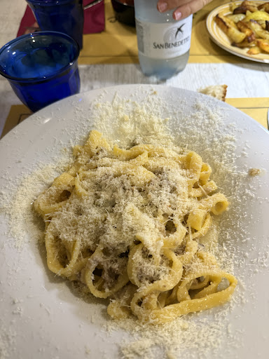 I am not sure what other folks didn't like, but this was a great experience in the neighborhood where we were staying. I had been trying for several days to try some cacio ai pepe, which I understand to be a uniquely Roman specialty. This place had ravioli ai pepe. There were just four in the dish but it was perfect: delicious filling, perfect pasta texture (not overcooked), superb olive oil and ground black pepper. Somehow simple and conplex.. I had also ordered "broccoli" which turned out to be spinach sauteed in butter and something spicy. So delicious. Really hit the greens spot I had been aiming for. The ubiquitous bread basket was deliciously multigrainy, the house white wine was delightful (in the sweet spot between dry and sweet) and came in the right sized wee carafe for 1 adult. My 11 and 14 year old had various preparations of grilled steak/fillet (bistecco/filleto) as well as the bread. We were all satisfied, and for much less than worse meals in the city center. Perhaps we are easy to please. But nonetheless, we...
