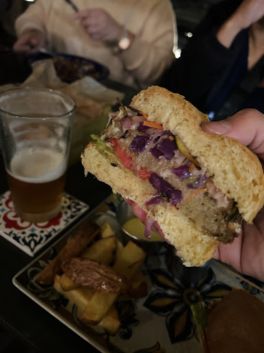 Made a last-minute stop at Apoteca for a drink, and what a delightful surprise it was! Upon perusing the menu, I couldn't resist ordering the "ApotecaBurgerVeg," which came with a homemade bun, eggplant burger, tomato, lettuce, sautéed vegetables, and provolone. It was served with a side of french fries, homemade ketchup, and mayo.