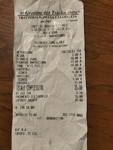 Non mi piace dare giudizi negativi, se qualcosa non mi è piaciuta, non lascio commenti.Questa volta però sento la necessità di esprimere le mie perplessità. Dopo aver visto un video su YouTube che descrive questa trattoria, ci sono andata ieri insieme a mio marito. Grande delusione...personale gentile ma siamo stati serviti con forte ritardo, notando altri tavoli serviti prima nonostante i clienti siano arrivati dopo di noi. Seconda cosa: nel video di cui vi parlo i due youtuber che pubblicizzano il locale, parlano di porzioni super abbondanti servite in fiamminghe di acciaio, cosicché quando il cameriere viene a prendere l'ordinazione ci chiede se vogliamo la porzione intera o la mezza, noi chiediamo l'intera credendo di mangiare quella pubblicizzata dai 2 youtuber e per una cacio e pepe (€ 14) e per delle mezze maniche all'amatriciana (€13) ci arrivano con dei piatti che se tanto mi dà tanto ,sono delle mezze porzioni, lo facciamo presente al ragazzo, il quale ci fa notare come quelle arrivate al nostro tavolo siano porzioni intere, però, vi posso garantire nulla a che vedere con le fiamminghe pubblicizzate. Ne parliamo con il cameriere e risponde che quella nella fiamminga è una porzione con un'integrazione extra di 100gr.di pasta che avremmo dovuto richiedere noi al momento dell' ordinazione, però questa integrazione non ci è stata proposta dal cameriere e non vi è traccia nemmeno nel menù...insomma per una cacio e pepe €14 (anche della cremina tanto ben descritta nei particolari e decantata dai due youtuber non vi è traccia nel piatto) e per una amatriciana €13 di medie proporzione, ovvero poco abbondanti, i prezzi ci sono sembrati davvero alti ...dopo esserci confrontati con il ragazzo (gentile ed educato) , hanno tolto 10 euro dal conto finale; sia chiaro nulla è dovuto, ma alla fine abbiamo pagato quello che i piatti valevano...niente vino della casa ma solo bottiglie da cl.75 a €16 circa, giusto una piccolissima bottiglia di cesanese, da 375ml. e un Merlot sempre da 375ml.rispettivamente da €8,00 e € 10,00 che non abbiamo preso neanche in considerazione, visto i prezzi era più conveniente la grande (forse una trattoria una buona caraffa, "foietta", di varie misure dovrebbe proporla in alternativa) . La sensazione è stata quella di essere stati presi in giro e tra l'altro il tutto per nulla fedele al video sopra citato visto su YouTube...N.B Ho inviato lo scontrino che fa fede a quanto scritto nel post di questa mattina, ci sono anche le riduzioni applicate alla cacio e pepe e all'amatriciana, dato che nessuno di voi ricorda la conversazione avuta con il personale e la nostra " visita" (così detta dal titolare nella sua risposta) nonostante sia passato solo un giorno; lo scontrino l'ho recuperato nella spazzatura poco fa', lo avevo gettato in quanto non pensavo dovessi dimostrare quanto scritto, ero entusiasta di venir da voi per il pranzo ed in buona fede nel farvi notare la mia delusione questa mattina e lo dimostra anche il fatto che non ho fatto alcuna foto alle pietanze da voi cucinate e servite. Cordialmente. La porzione "Grottino" le potrà sembrar strano, non ci è stata proposta, non sapevo neanche si chiamasse così. Vi abbiamo subito messo al corrente delle nostre perplessità sia al tavolo, lasciando detto ad un ragazzo educato e gentile, , lo sottolineo nuovamente. Sbagliare è umano specialmente in giornate piene di sole e di lavoro come quella di ieri. Se ho recensito in questa maniera non è stato per avere un risarcimento, ma per la delusione provata vedendo il video confrontato poi con l'esperienza presso il vostro locale. Stia tranquillo che è l'ultima risposta che invio.Passo e...
