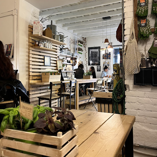 Welcoming staff, a fresh look and ingredients, but an uninspiring menu (music selection is often better: 80s pop). This is a much needed healthy heaven for vegi & vegans that sadly looks better than it is, however much I'd want this truth not to be so. Good place for a quick self-service bite - if you are in the area, but perhaps not a place to linger or hang with friends (stool seating is not that comfy). This is one of two small vegetarian cafes (seats about 14 people) by the same owners. On the menu you will find a few curries and vegan/veggi burgers plus a range of uncomplicated salads, raw juices and a small selection of bio deserts. It is all very fresh and good, but not exceptional. I think the curries are the best bet. Inexpensive (as bio places go). There is a small accessible toilet...