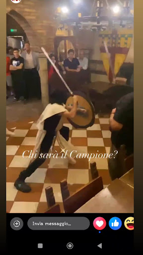 Per il resto il locale era davvero molto bello. Si trovano armi e armature un po' ovunque in giro per il locale. Alcuni ordini, prevedono che il cameriere ti porti una corona, se non addirittura una spada o qualcosa che lo ricordi, cone una replica, portata a tavola con il tagliere. In alcuni casi, portano dei simpatici e piccoli elmi stile gallico/norreno, di quelli alla asterix & obelix con le corna, piccolini e diplastica, da mettere in testa quando si ordina il piatto che lo prevede. Inoltre c'è la possibilità di affittare una casacca da templare, o degli abiti medievali, con una corona di qualità superiore rispetto a quella che danno con l'ordine alimentare, e a quel che ho capito, è una corona che si può anche affittare. So che la danno al festeggiatio, nel caso si festeggi da loro, perché ho visto che la portavano ad un festeggiato. Inoltre alcune bevande ordinabili, prevedono che siano servite in un bicchiere particolare, io ad esempio ho visto un una bevanda -presumibilmente alcolica- servita in un corno. Nel locale viene riprodotta musica che ricorda o che lasci immaginare l'evo antico. I camerieri sono molto molto gentili. La cameriera invece, ragazza dolcissima. Il proprietario gira per i tavoli parlando con le persone di ogni tavolo, uno alla volta, assicurandosi che stia andando tutto bene. È stato molto paziente con i clienti. Io ho partecipato e non ho vinto per un soffio il torneo di spade, aggiudicandomi il 2° posto, per un soffio dal primo posto. Il proprietario è stato paziente con la clientela, e ho visto che ha lasciato i pischelli più giovani toccare le spade, mentre pazientemente li teneva d'occhio. Quasi dimenticavo: Il personale capita che l'inverno, quando la temperatura lo permette, serva ai tavoli o si aggiri per il locale in abito storico. In 2 abbiamo speso 60 circa. Quindi 30€ a persona. Il coperto non lo fanno pagare.