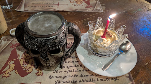Read moreLocale per buone forchette ma innamorate del fantasy e con passione per il medioevo. Si tratta di un ristorante, ma con una parte del locale che offre un servizio di pub. L'atmosfera è coinvolgente, musica a tema. Davvero carino e curato nei particolari, è diviso in ambienti collegati tra loro. Una zona dedicata al ristorante in cui troneggia una tavola rotonda per una decina di persone e si allineano diverse tavolate. L'altra con tavolini dedicati al pub. Esiste infine una terza zona, dove per tutta la settimana c'è una seconda tavola rotonda più grande, ma il venerdì viene trasformata in una sala per i duelli con spade di lattice in tornei improvvisati tra sfidanti. I piatti hanno tutti nomi calati nel contesto, ed è un locale dove si può gustare una cena completa ma anche ricchi aperitivi. All'esterno uno spazio per consumare fuori ma il fascino degli ambienti interni richiama la gente a mangiare dentro. I festeggiati possono essere vestiti con abiti medievali. All'ingresso sono in vendita, per chi ha voglia di regalarsi un ricordino aggiuntivo, anche monili e gadget con varietà di prezzi per tutte le tasche: da collanine a braccialetti a boccali intarsiati, coroncine e via dicendo. Il proprietario è capace di animare e creare, tra i tavoli, una partecipazione che diverte e rende la serata vivace. Non è un ristorante dove si parla a bassa voce ma gli ospiti non sono obbligati a partecipare alle attività. In un clima così si crea naturalmente un'atmosfera di condivisione. Menu vario, particolare, tutto intitolato in tono con il clima da locanda medievale, con diverse possibilità di scelta: piatti a base di carne, fritti, buona scelta anche per i vegetariani e pizza. Si gioca anche con menu ricalcato sulla gastronomia medievale, premiando miele e spezie. Dolci da applauso. Buono il vino della casa e la birra, nonchè le bevande speciali. Ci siamo divertiti molto pur essendo una tavolata "matura" da nerd anni 80 e con qualche persona anche più grandicella. Merita, anche perchè è una proposta originale e particolare. Sicuramente di venerdì e sabato c'è molta gente e ci si deve armare di pazienza, anche perchè c'è molto...